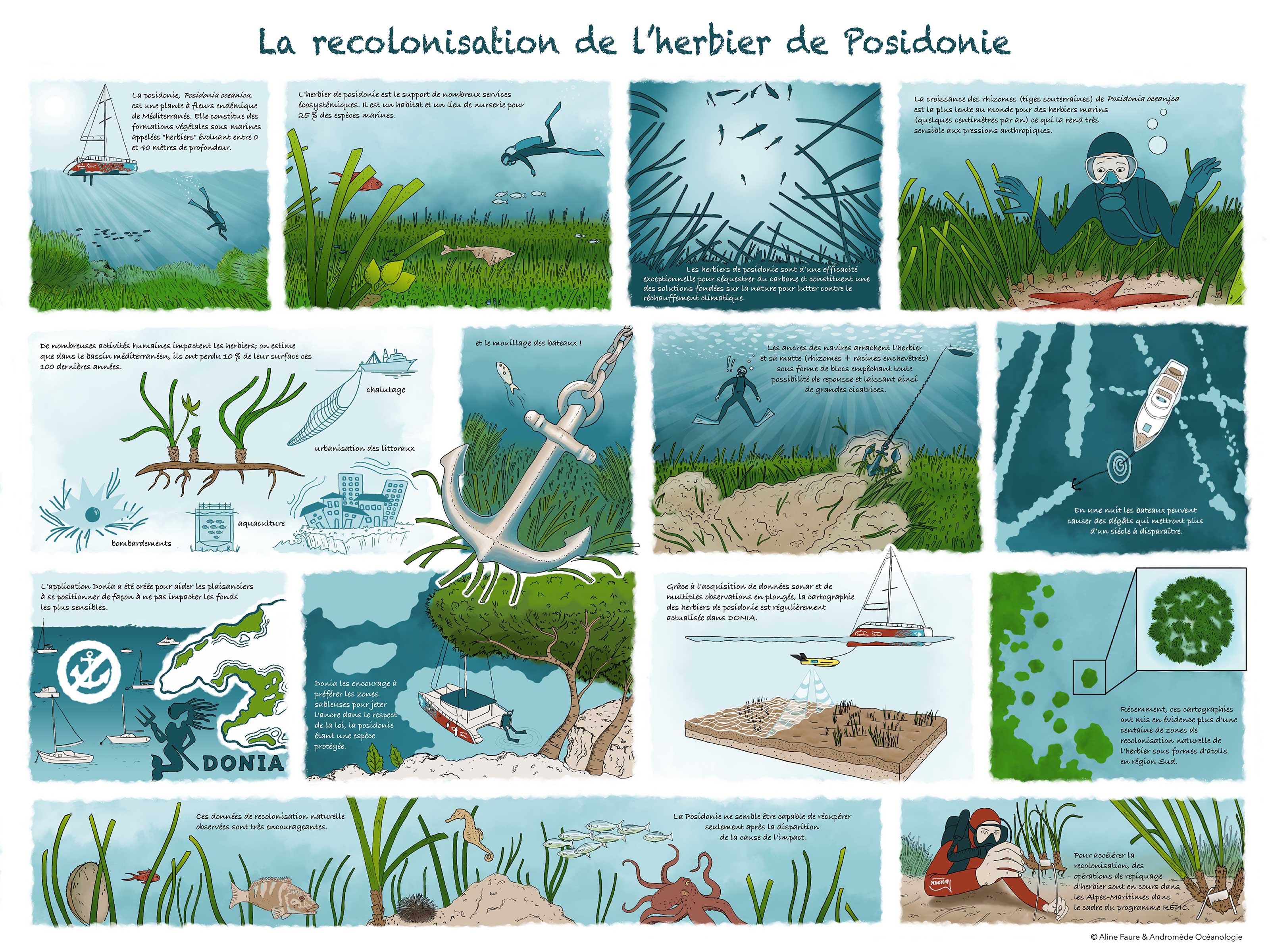 Bande dessinée de vulgarisation scientifique pour l'entreprise andromède océanologie sur les herbiers de posidonie, espèce protégée.